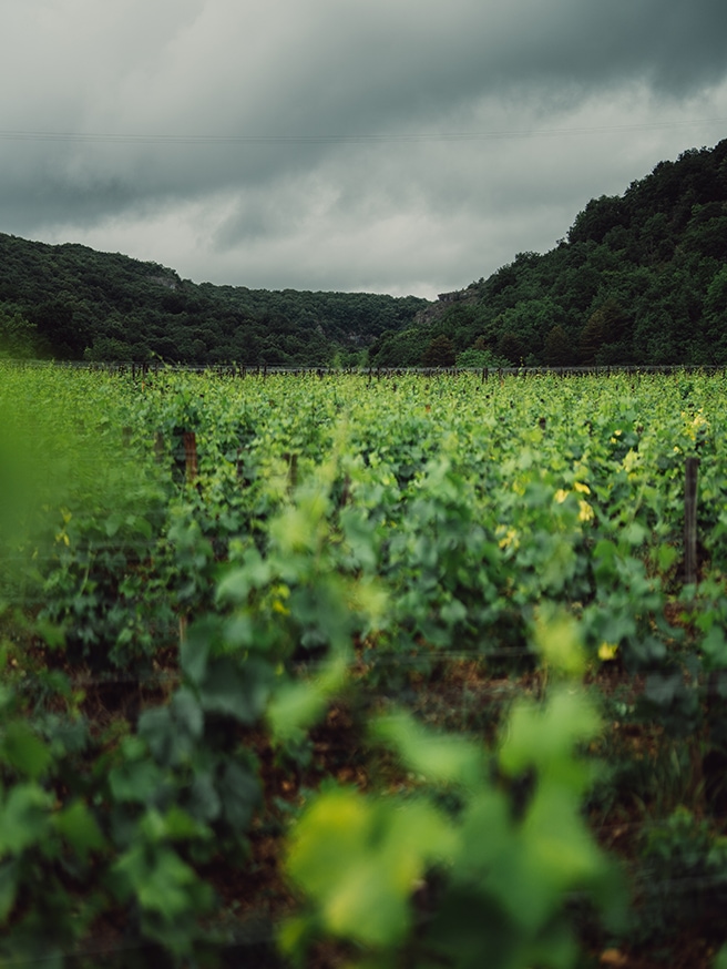 Un terroir à forte pente, orienté sud, mais bénéficiant de la fraîcheur de sortie de combe, structuré par la topographie encaissée du secteur.